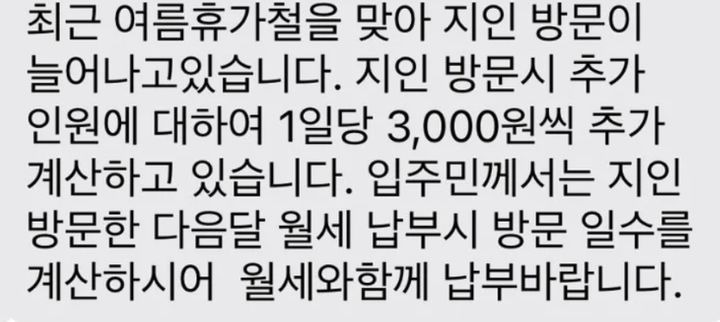 15일 온라인 커뮤니티 루리웹에 올라온 글에 따르면, 서울의 한 원룸에 거주 중인 세입자 A씨는 집주인으로부터 “여름 휴가철 지인 방문이 늘어나고 있다”며 “지인 방문 시 1일당 3000원씩 추가 요금을 월세와 함께 납부하라”는 문자를 받았습니다.