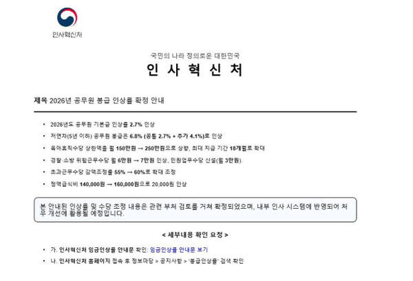 최근 인터넷 커뮤니티와 메신저를 통해 '2026년 공무원 봉급 인상률 및 수당 안내'라는 제목의 문서가 확산되며 큰 혼란이 빚어졌습니다. 해당 문서는 실제 인사혁신처가 발송한 것처럼 보였지만, 사실은 훈련 목적으로 제작된 가짜 문서였던 것으로 확인됐습니다. 📄