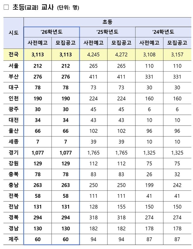 학령인구 감소 여파로 우려되던 임용대란이 현실이 됐다. 교육부는 10일 발표에서 2026학년도 공립 초등교사 신규 채용 인원이 올해보다 27% 줄어든 3113명으로 확정됐다고 밝혔다. 이는 2025학년도(4272명) 대비 무려 1159명 감소한 수치다.