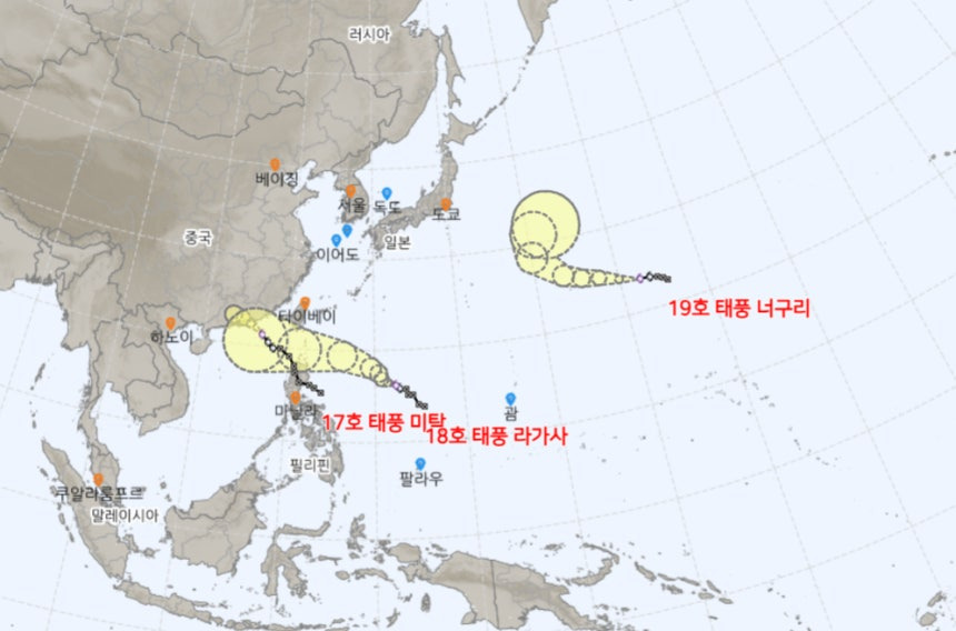 이번 주말, 전국에 가을비가 내리는 동시에 세 개의 태풍이 잇따라 발생해 주의가 필요합니다. 기상청에 따르면 17호 태풍 미탁, 18호 태풍 라가사(Ragasa), 19호 태풍 너구리(Neoguri)가 연달아 모습을 드러냈습니다.