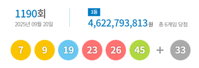 - 1등 번호: 7, 9, 19, 23, 26, 45