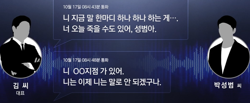 취재 결과, 박 씨가 숨지기 직전 이틀 동안 대표 김 씨는 총 7차례 통화에서 40회가 넘는 욕설과 협박을 쏟아냈다.